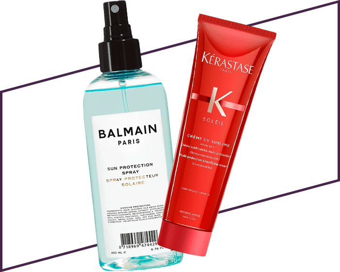 Det finnes et hav at solbeskyttende hårprodukter. Start dagen med en solkrem i håret før du går ut døren. Her tenker du sikkert hva sa du, sa du. Men ja, du leste riktig. Det finnes produkter som beskytter håret mot solens slitasje på samme måte som den solkremen du putter på huden, bare ikke som klissete krem. Det finnes mange gode varianter, som er usynlige ved påføring og som ikke tynger håret. Disse påføres som regel i sprayform og vi vil gi deg best resultat ved påføring før du går hjemmefra og tar fatt på en ny dag. Bilde: Balmain Sun Protection Spray og Kérastase Crème UV Sublime.